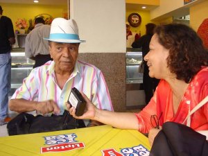 Selma Campos (na foto, entrevistando o Monarco. Esse é o retrato da Selma: sempre apurando uma notícia, pensando no leitor, antes de tudo)
