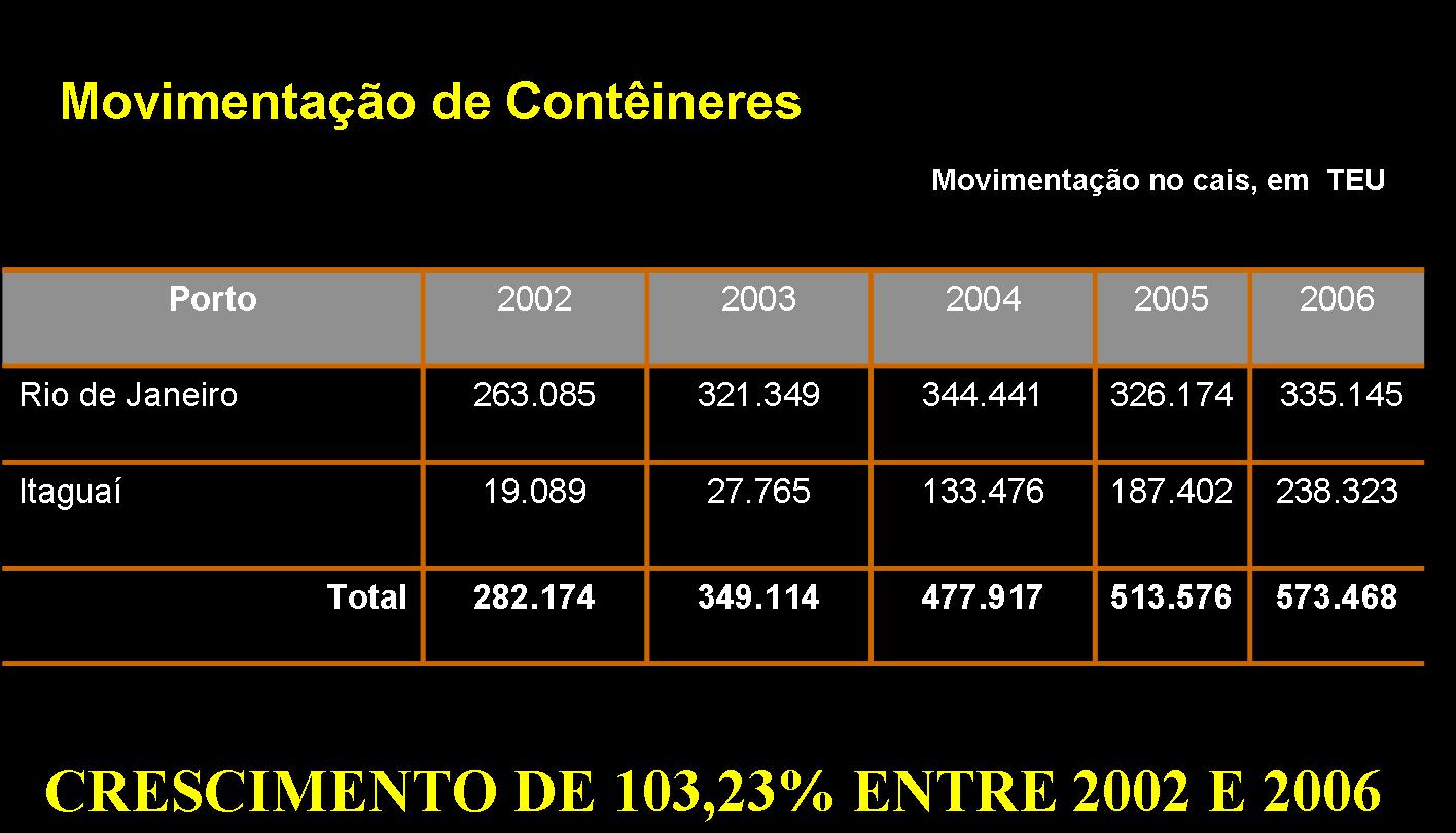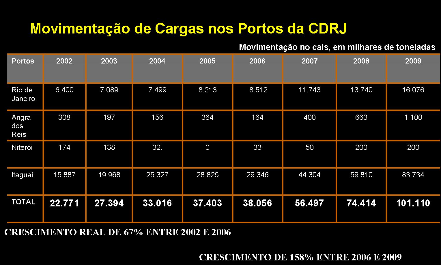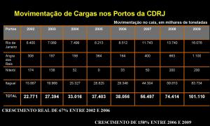 Como se pode ver na tabela da esquerda (clique na imagem para ampliar), o crescimento real da movimentação de cargas, nos quatro portos sob a administração da Cia. Docas do Rio de Janeiro – CDRJ -, foi de 67% entre 2002 e 2006.