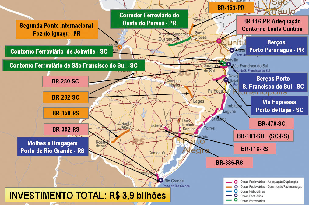 Os investimentos do Governo Federal previstos no Programa de Aceleração do Crescimento – PAC permitirão ao DNIT incrementar o volume de recursos para as obras de infra-estrutura de transportes em todo o País, em especial no Rio Grande do Sul.