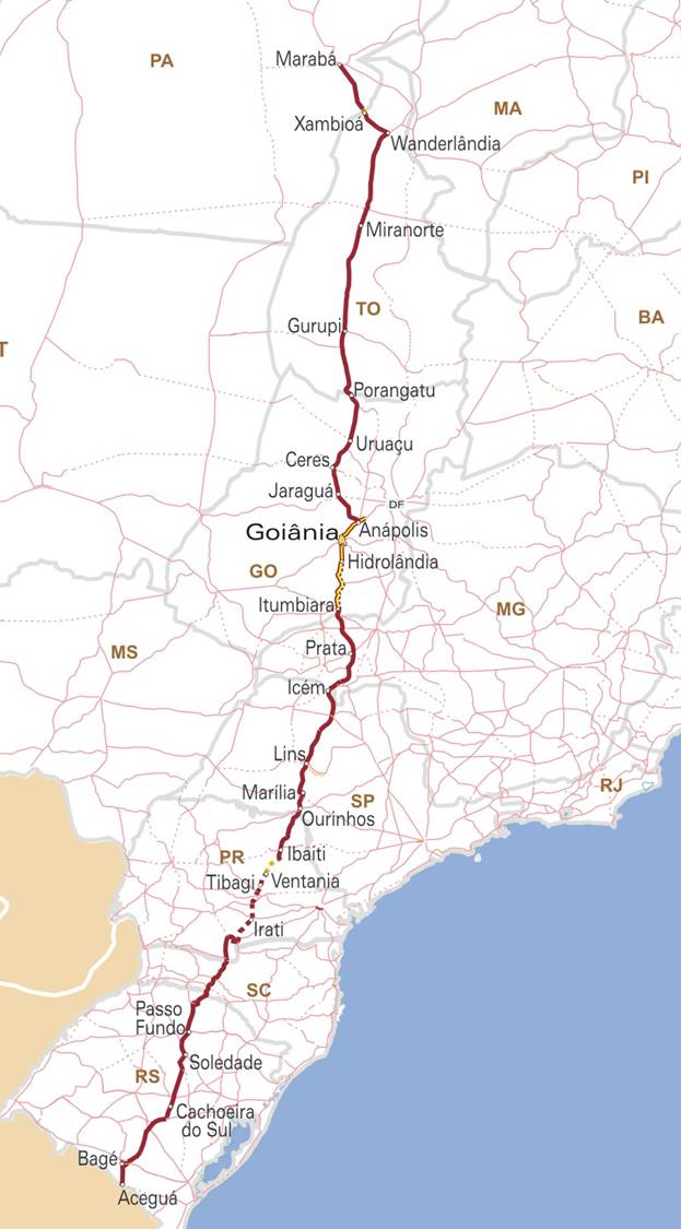 A imagem mostra a BR-153 (a quarta maior rodovia brasileira), ligando Marabá (Pará) a Aceguá (Rio Grande do Sul), com 4.355 quilômetros. É conhecida como Transbasiliana. De Anápolis (GO) até Wanderlândia (TO) é conhecida como Belém-Brasília.