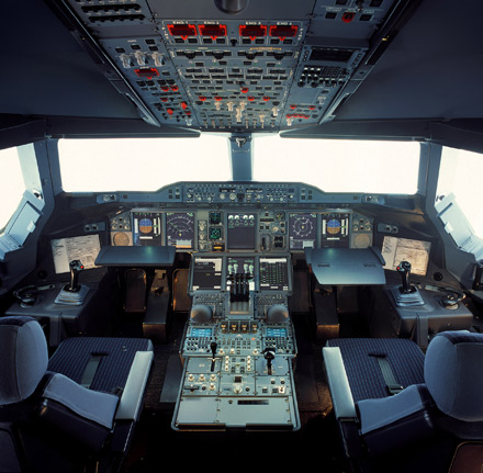 Foto da cabine de comando do A380, maior avião de passageiros do mundo, ainda em fase experimental.