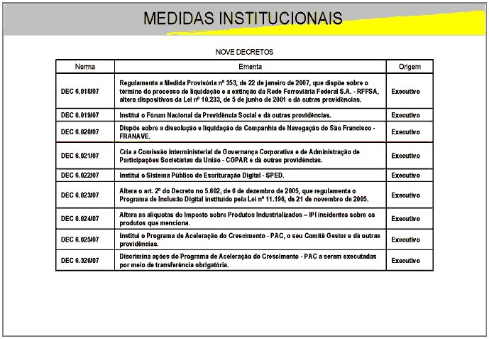 O Executivo também editou nove decretos no âmbito do PAC , tratando de temas tributários, previdenciários e relacionados à gestão do Estado.