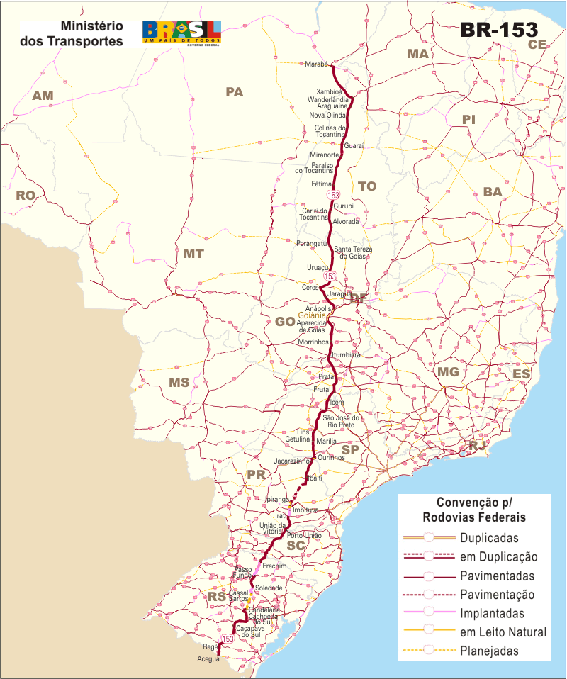 Conhecida como Rodovia Transbrasiliana, a BR-153 liga Belém do Pará, a Aceguá no Rio Grande do Sul. É uma ligação norte – sul, a exemplo das BR’s 116 e 101.