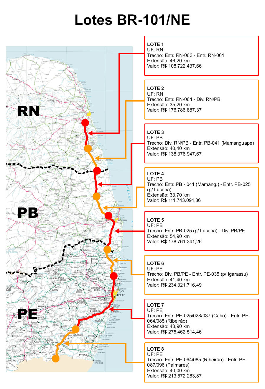 Em Pernambuco, 125 quilômetros da BR-101 estão em obras, em três trechos: da divisa com a Paraíba, no município de Goiana, até Igarrasu (lote 6), do Cabo até Ribeirão (lote 7) e de Ribeirão até Palmares (8).